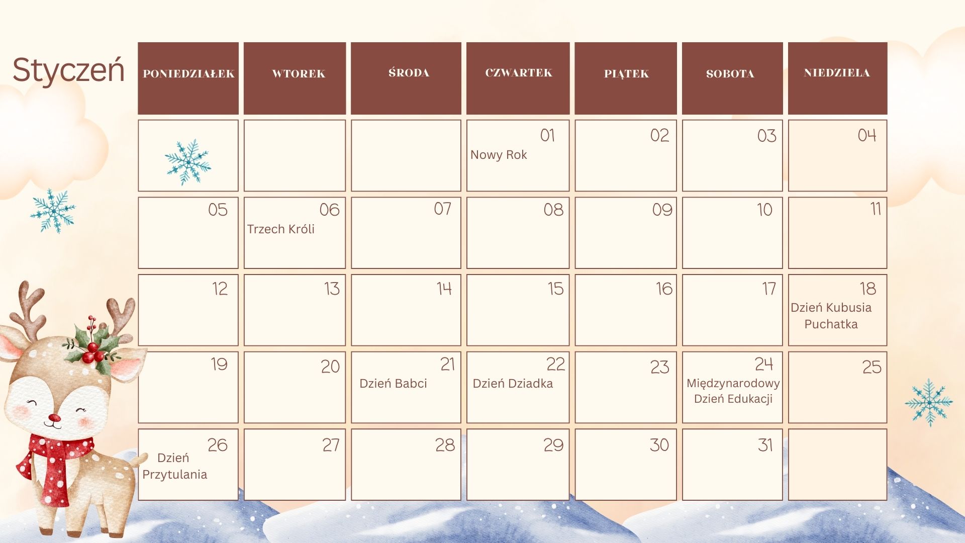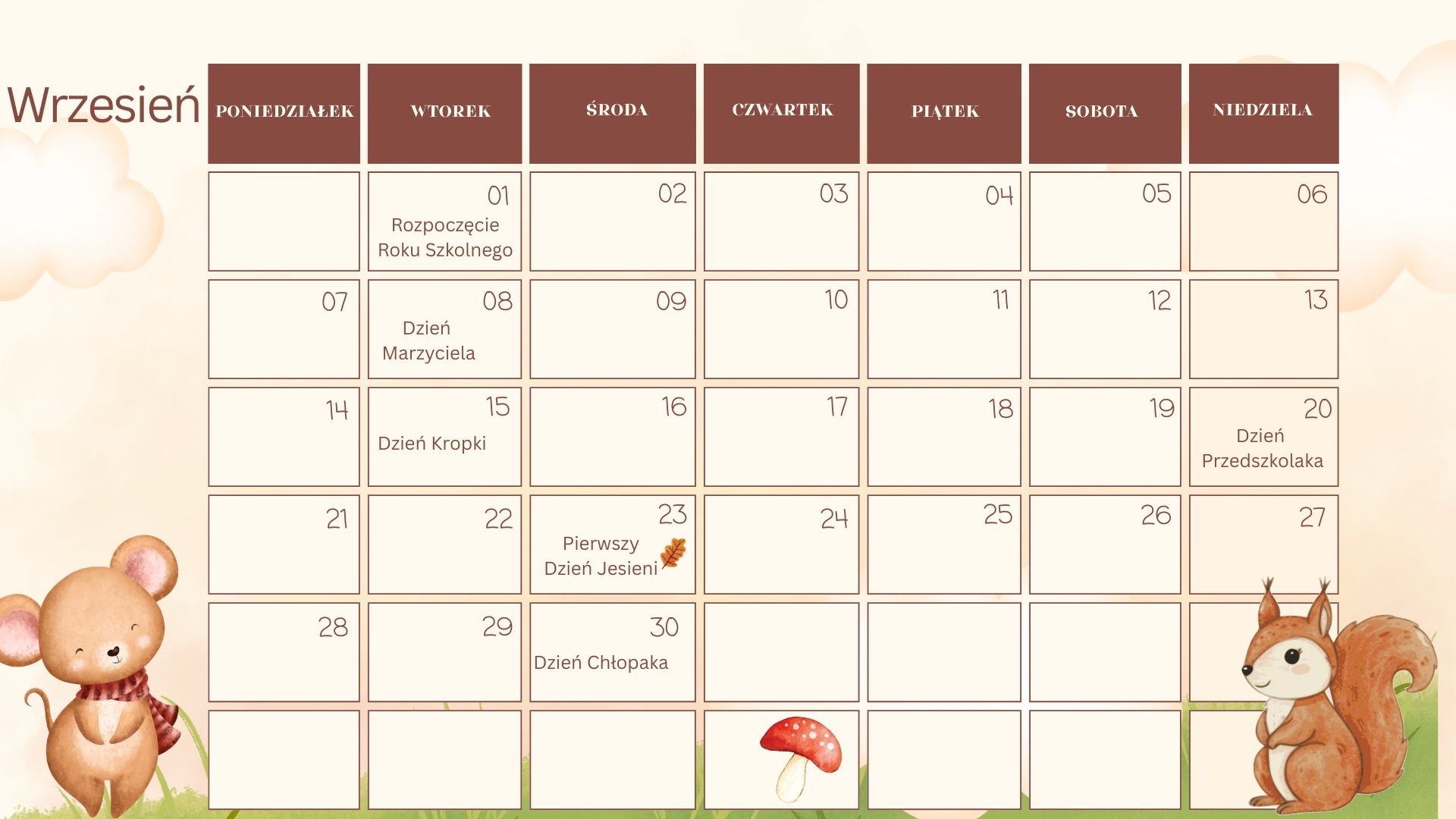 To kalendarz zaprojektowany specjalnie z myślą o nauczycielkach przedszkola oraz edukacji wczesnoszkolnej — praktyczny, estetyczny i gotowy do natychmiastowego wydruku.